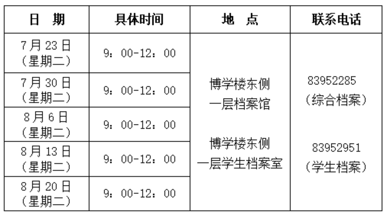 地点:博学楼东配楼一层干部档案室,联系人:耿老师,电话:010-83952781。