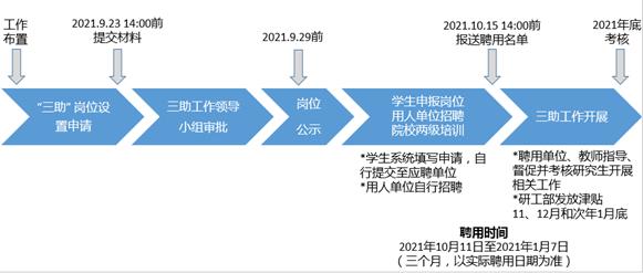 为提高我校研究生参与学校管理、教学、科研的积极性,增强研究生自教自管和实践创新能力,发挥研究机构和导师参与人才培养的作用,依据《首都经济贸易大学研究生助教、助研、助管工作管理办法》要求,现将2021-2022学年第一学期研究生助管、助教、助研(以下简称“三助”)岗位聘用事宜通知如下: