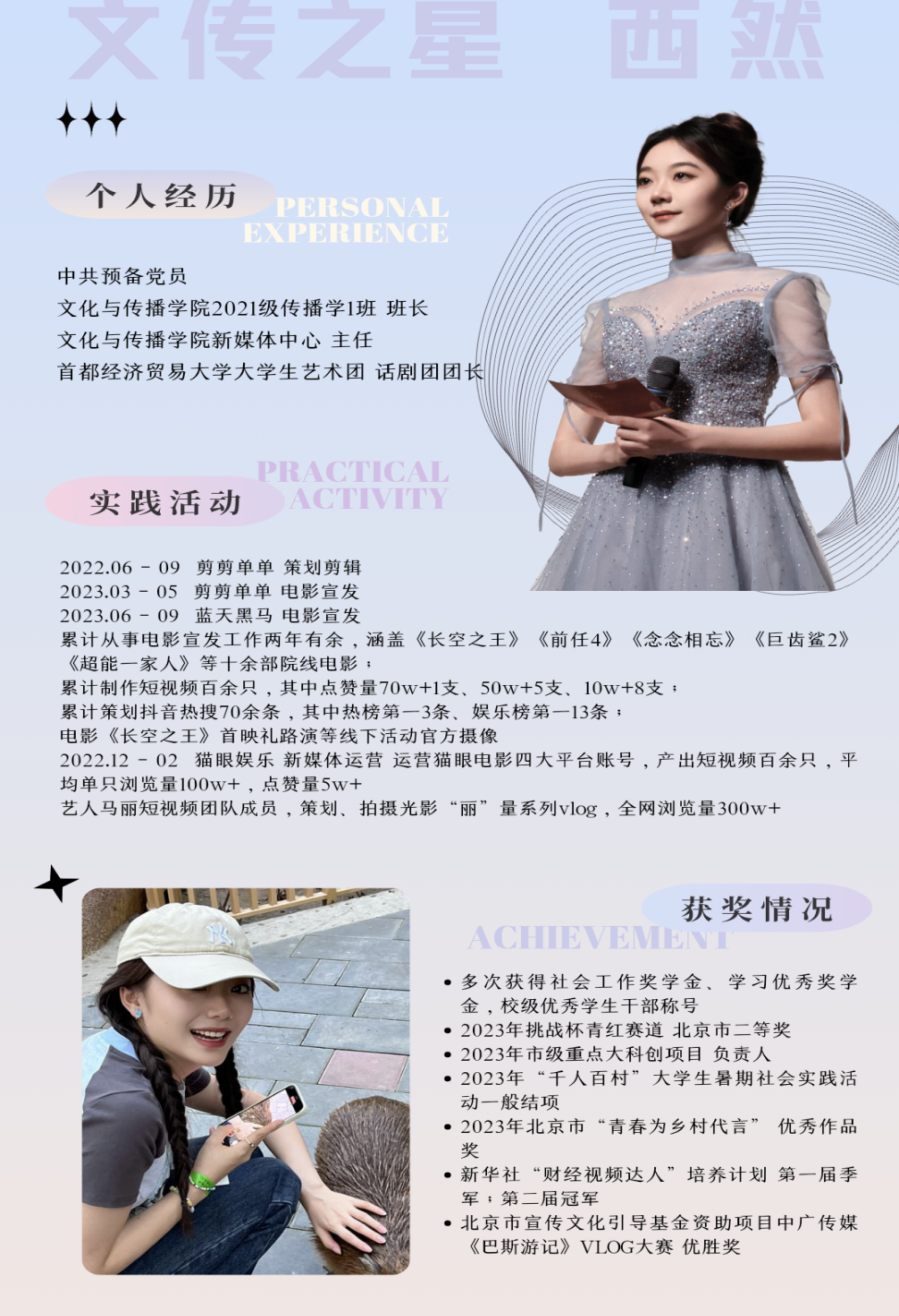她的实践经历更是令人惊叹不已,在专业领域中展现出了非凡的实力和卓越的才能,仿佛拥有了一把开启无限可能的钥匙。她累计从事电影宣发工作两年有余,涵盖《长空之王》《念念相忘》《超能一家人》等十余部院线电影,运营猫眼电影四大平台账号,产出短视频百余只。
